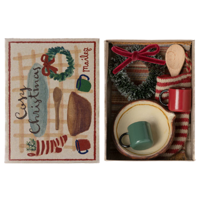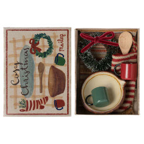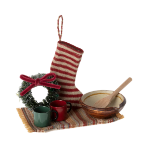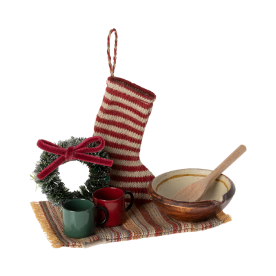 Set de Noël composé d'une chaussette de Noël, un tapis, une couronne, deux tasses, un bol avec une cuillère en bois. Parfait pour la famille souris.