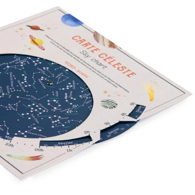 Avec la carte Céleste, apprends à te repérer dans le ciel une fois la nuit tombée Tiens ta carte au-dessus de ta tête, orientée vers le nord et observe ! Les constellations et les étoiles n'auront bientôt plus de secrets pour nos astronomes.