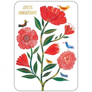 Carte postale "joyeux anniversaire" illustrée d'une fleur avec des oiseaux !