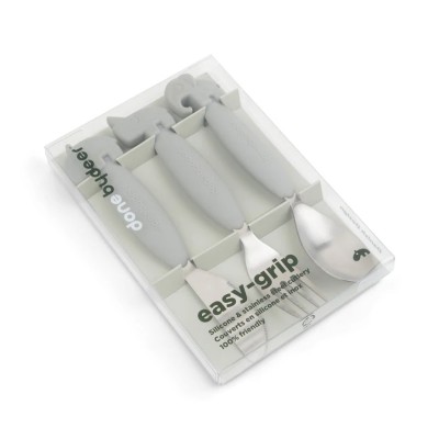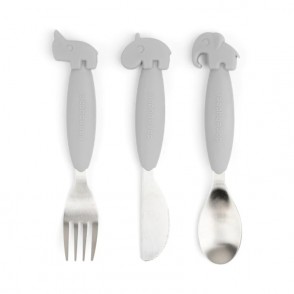 Ce set de 3 couverts en inox et silicone gris est pratique avec prise ergonomique pour apprendre à manger seul et en toute sécurité.