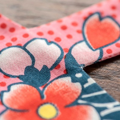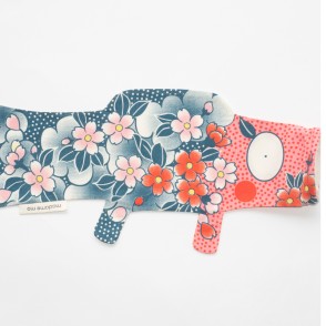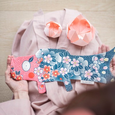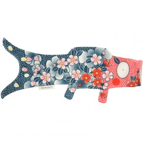 Ce Koinobori dessiné par Madame Mo est en coton bio, il est dans des tons roses oranges et bleus et de jolies fleurs colorent les écailles de la carpe.