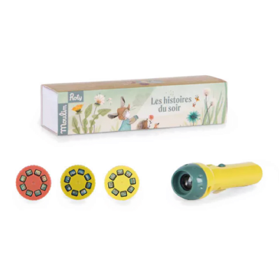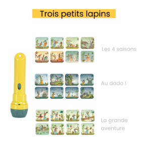 Lampe torche de poche ou chacun des 3 disques projetés sur le mur raconte les aventures de Petits lapins !