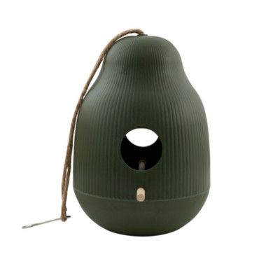 Cette mangeoire à oiseaux a une belle forme, elle est en bambou et de couleur verte eucalyptus