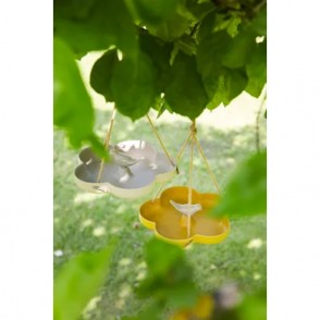 Cet nichoir à oiseaux est en forme de gland et de couleur ocre, il est en bambou