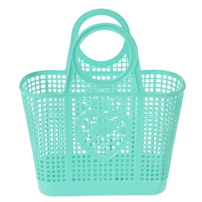 Le Panier "Amélie" de couleur vert aqua en plastique souple avec des décorations de coeur et de fleur de chaque côté.