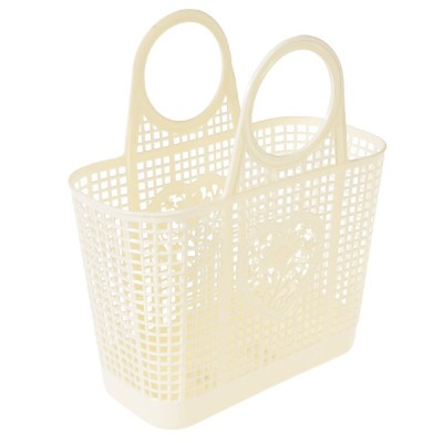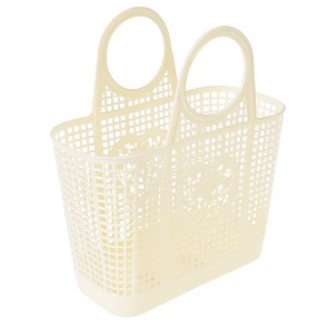 Le panier "amélie" couleur crème en plastique souple avec des décorations de coeur et de fleur de chaque côté.