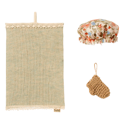 Ensemble de bain composé d'une serviette, d'un gant et d'un bonnet de bain !