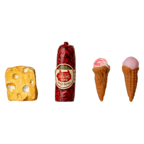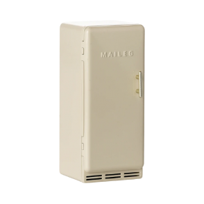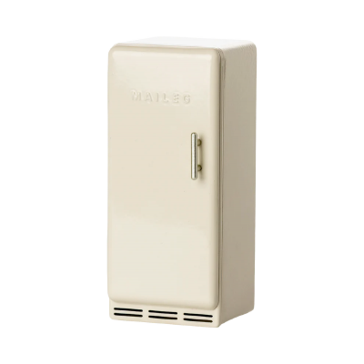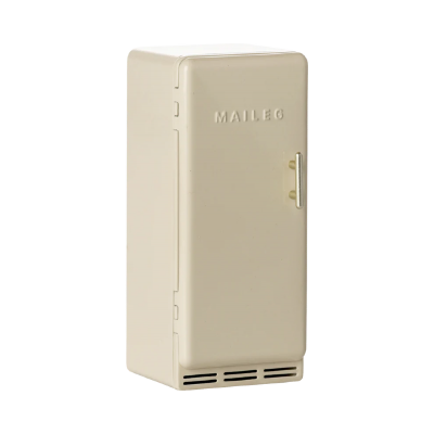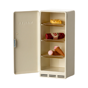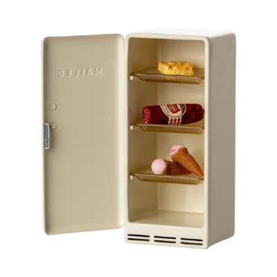 Un réfrigérateur vintage pour la maison souris. À l'intérieur, vous trouverez un morceau de fromage, un saucisson et quelques glaces.