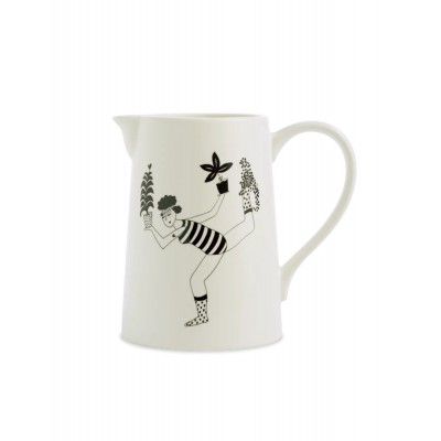 Pichet en porcelaine avec un dessin d'un homme avec un bouquet de fleurs.