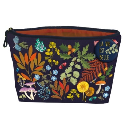 La trousse est imprimée d'un chat et de fleurs