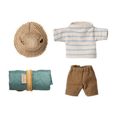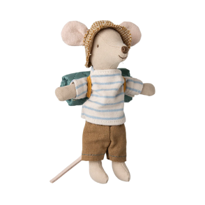 Randonneur souris grand frère avec son pantalon, son pull et son chapeau. Il est équipé de son petit duvet pour dormir à la belle étoile !