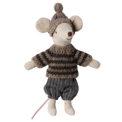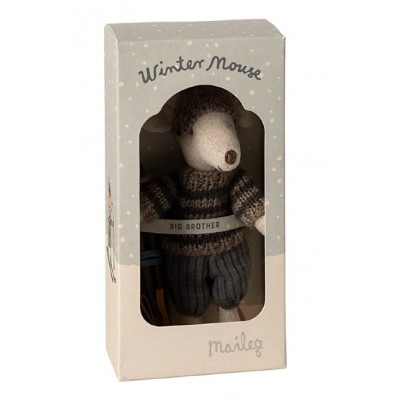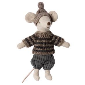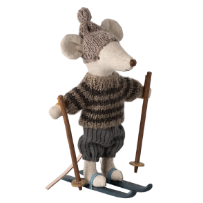 Grand frère souris est prêt pour la montagne avec son ensemble pull, pantalon et bonnet... sans oublier l'essentiel ses skis et bâtons !