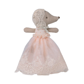 Cette souris bébé se prépare pour une journée de célébration. Elle porte une magnifique et délicate robe rose, assortie d'une jolie coiffe en dentelle.