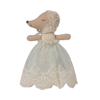 Cette souris bébé se prépare pour une journée de célébration. Elle porte une magnifique et délicate robe rose, assortie d'une jolie coiffe en dentelle.