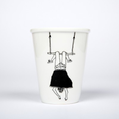 Tasse en porcelaine décorée d'une fille faisant du trapèze Helen B, créatrice belge.