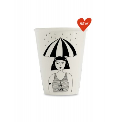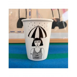 Tasse en porcelaine décorée d'une femme épuisée par Helen B, créatrice belge.