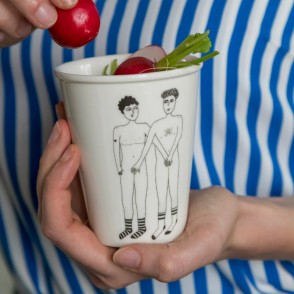 Tasse en porcelaine décorée d'une femme qui se rafraîchie par Helen B, créatrice belge.