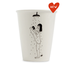 Tasse en porcelaine décorée d'un homme assis dans une tasse à café par Helen B, créatrice belge.