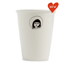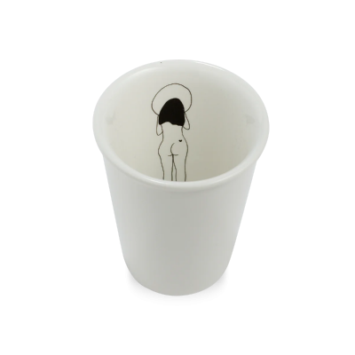 Tasse en porcelaine décorée d'une personne passant sa tête à travers la tasse par Helen B, créatrice belge.