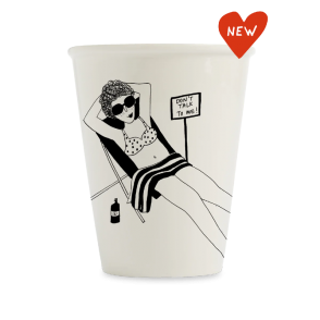 Tasse en porcelaine décorée d'une femme qui bronze par Helen B, créatrice belge.