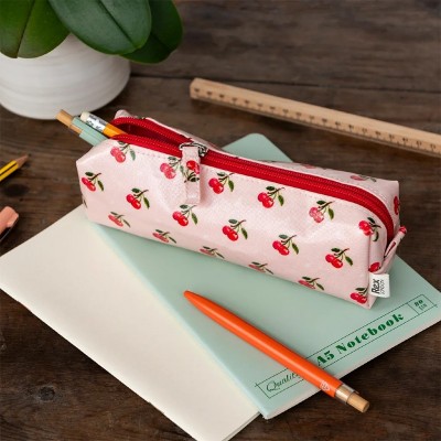 Trousse pour enfants rose, ornée de grappes de cerises rouges éclatantes.